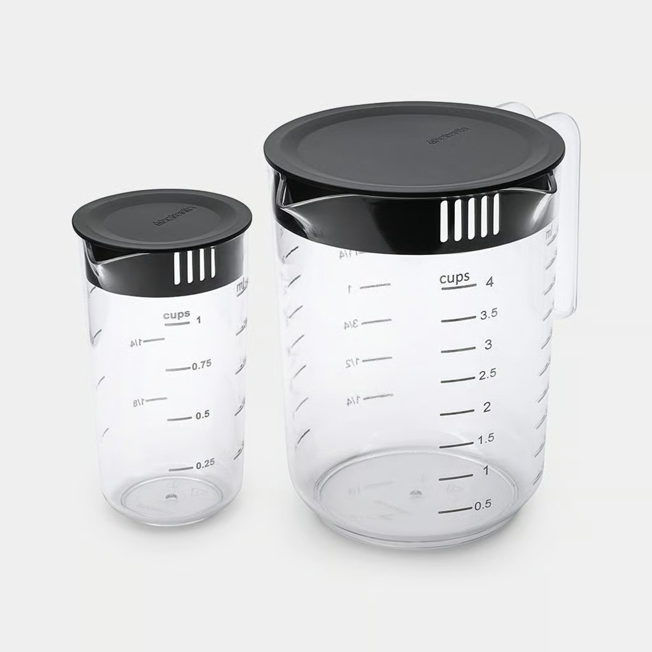 All clear in the kitchen with this set of two smart Brabantia Tasty+ Measuring Jugs. Both the 1L version and the 250 ml jug have clear, easy-to-read measurements in cups and ml; with a spout and slotted lid for pouring and filtering at the same time. Made from high-quality, food-safe materials and space-efficient too! A jug to hug.